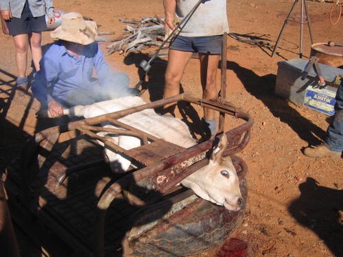 Donner à boire aux vaches orphelines le matin, prendre le petit déjeuner avec la famille, se retrouver tous ensemble dans le paddock ou le yard, rassembler les troupeaux, faire passer les vaches dans le yard suivant, les marquer au fer chaud, castrer les bébé taureaux, leur mettre l’étiquette sur l’oreille…Tel est mon quotidien en ce moment. Le travail ressemble souvent a un jeu ici, dans le yard plein de poussière, ou une vache affolée est toujours prête a charger le premier venu.