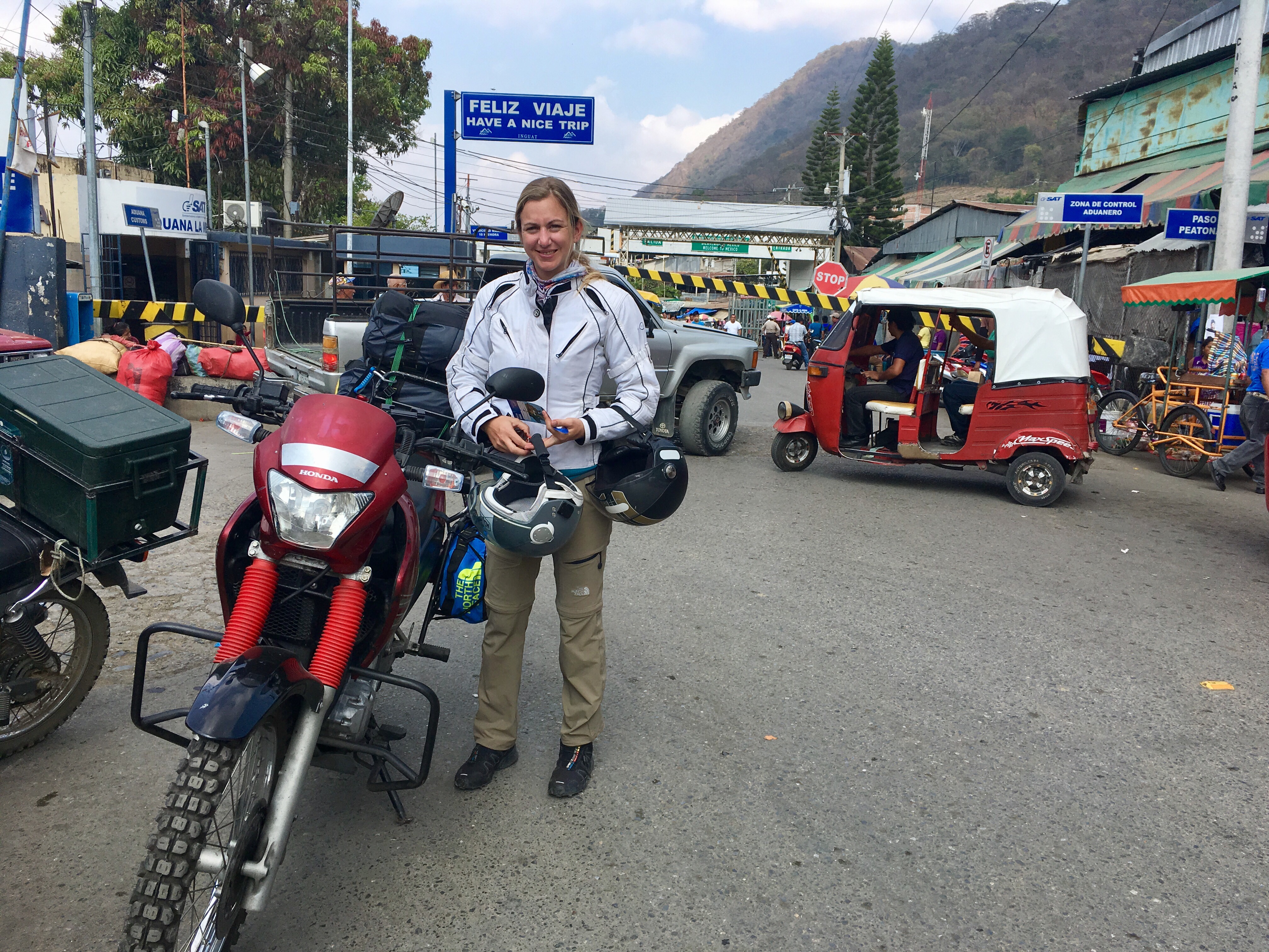 đȘđž Cuando decidimos de pasar a otro paĂs, es tanto para seguir al sur que verificar que todo estĂ© en regla en las fronteras. Hemos luchado para obtener papeles a nuestro nombre. Ya es tiempo de verificar que podremos continuar el viaje. La frontera mexicana pasada con un cello de salida, debemos de entrar a Guatemala con nuestros pasaportes y papeles de moto en regla. Cada salida de un paĂs sirve para la entrada del otro. Para los pasaportes se hace rĂĄpido. Deberemos de aprender a ser muy paciente y tener otra visiĂłn del tiempo en lo que se refiere a la aduana. AllĂĄ, DespuĂ©s de algunas verificaciones de la moto, hay que hacer las tramites, casi todo escrito a mano, y pagar el ingreso de entrada. Una hora y medio, aquĂ estamos ! En un paĂs con una moto extranjera! Tantas trĂĄmites de preparaciĂłn para lograr el pasaje de cada frontera. Ya estĂĄ. AsĂ se abre el nuevo capĂtulo del viaje. La ruta hasta la ciudad de Guatemala nos recuerda los tiempos de viaje en Asia : mujeres vestidas den conformidad con sus etnias, plantaciones y habitaciones hasta arriba de las montañas… india ? ViĂȘt Nam ? Un poco de todo. AquĂ estamos. La ruta sube hasta tener nubes pesados, visiĂłn limitada y cuidado con la velocidad. Los camiones ellos conocen la ruta y manejan y nos pasan como locos por las curvas. Esos camiones dan un ritmo a nuestro viaje, anteriormente buses de escuela en Estados Unidos, sirven ahora para transportes pĂșblicos, despuĂ©s de personalizarlo con colores y pinturas de las ciudades por las que pasan. Llegamos en la capital con mucho trĂĄfico, ahora para pasar la noche encontramos Danilo y Gabi una pareja autĂ©ntica y con mucha personalidad. Mañana, estaremos en la ruta, pasando nuevas fronteras, y siguiendo los lugares que nos aconsejaron. AsĂ vamos a viajar, sin libros y con pura inspiraciĂłn de la gente que encontramos. Y empieza muy bien!
