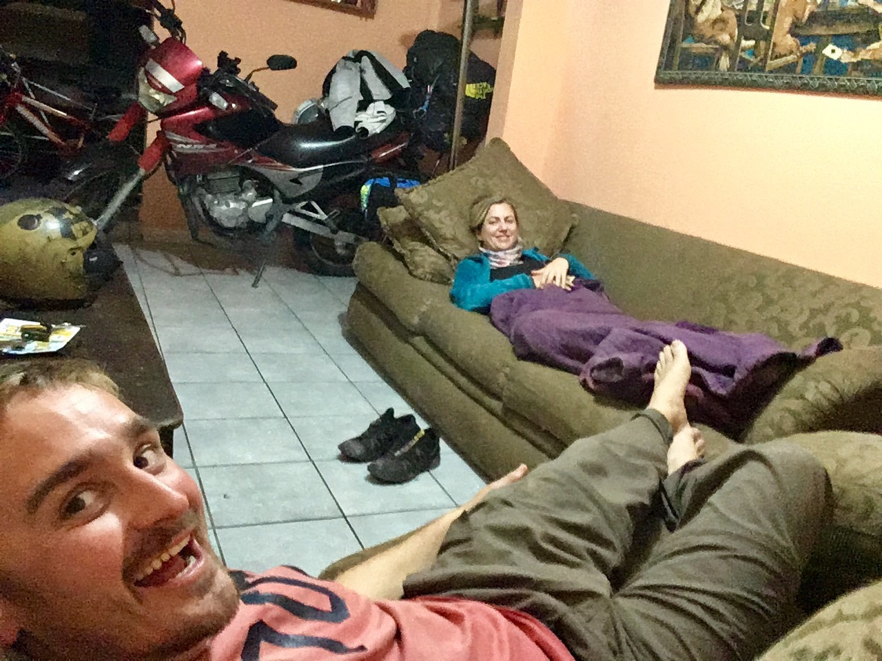 ExpĂ©rience ultime chez Danilo&Gabi : dormir dans le salon avec la moto !!đ«đ· Quand nous dĂ©cidons de sortir du Mexique, c’est autant pour continuer au sud que pour vĂ©rifier que tout est en rĂšgle lors des passages de frontiĂšres. La sortie du Mexique s’effectue sans problĂšme. L’entrĂ©e du Guatemala requiert un tampon pour nos passeports ET l’importation temporaire dans le pays. Ces dĂ©marches vont rythmer notre voyage de pays en pays. Au bout d’une heure trente de vĂ©rifications et de paperasse, nous pouvons enfin partir ! Excitation et fiertĂ© pour cette premiĂšre frontiĂšre, on sort de la ville frontiĂšre en chantonnant! Des milliers de kilomĂštres qui s’offrent Ă nous. Et un nouveau chapitre qui dĂ©marre, celui de la traversĂ©e de l’AmĂ©rique Latine.