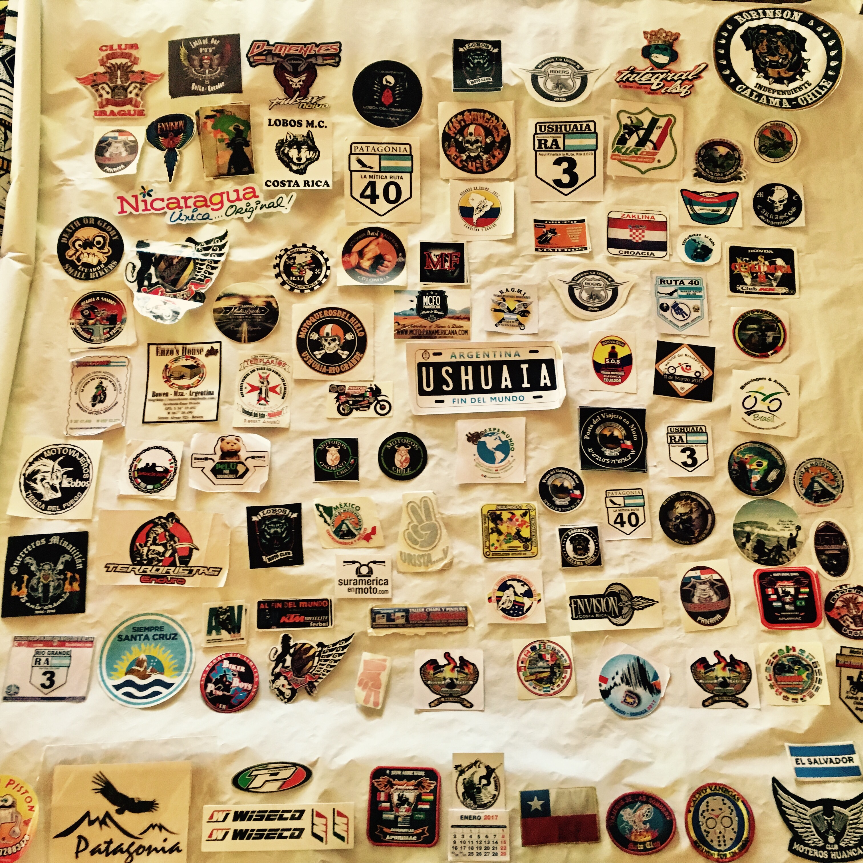 🇪🇸 Ahora en casa, es tiempo de abrir las mochilas, lavar la ropa con el jabón que conocemos desde niños, poner las cosas en la casa…y hacer la historia otra vez. Viajando en moto o de mochilero, no se puede llevar muchas cosas en su país. Entonces se quedan los mejores recuerdos en la cabeza, en los ojos, en el corazón. Y el corazón vibra cuando abrimos la bolsa de calcomanías que nos regalaron los amigos de la ruta. Y hay un montón de recuerdos cuando les vemos todos juntos así en la mesa. Una mesa para simbolizar la unidad motociclista, una mesa para llevar los amigos con nosotros en la ruta, una mesa que cuando la ves te da ganas de correr al garaje subir en la moto y salir por 500 km mínimo ! Así nos animamos. 2 días que estamos en casa y ya tenemos un nuevo proyecto, para salir lo más rápido posible !