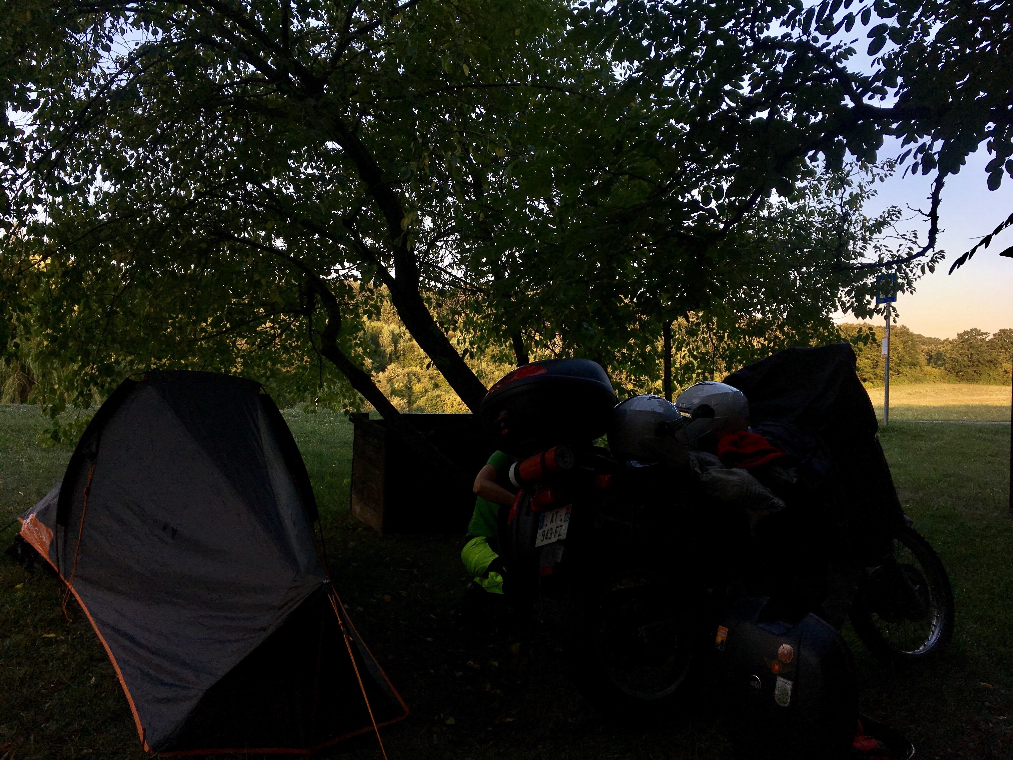 Puis nuit noire, il faut s’arrêter. Planter la tente en pleine nuit… pour découvrir où on est le lendemain matin :
