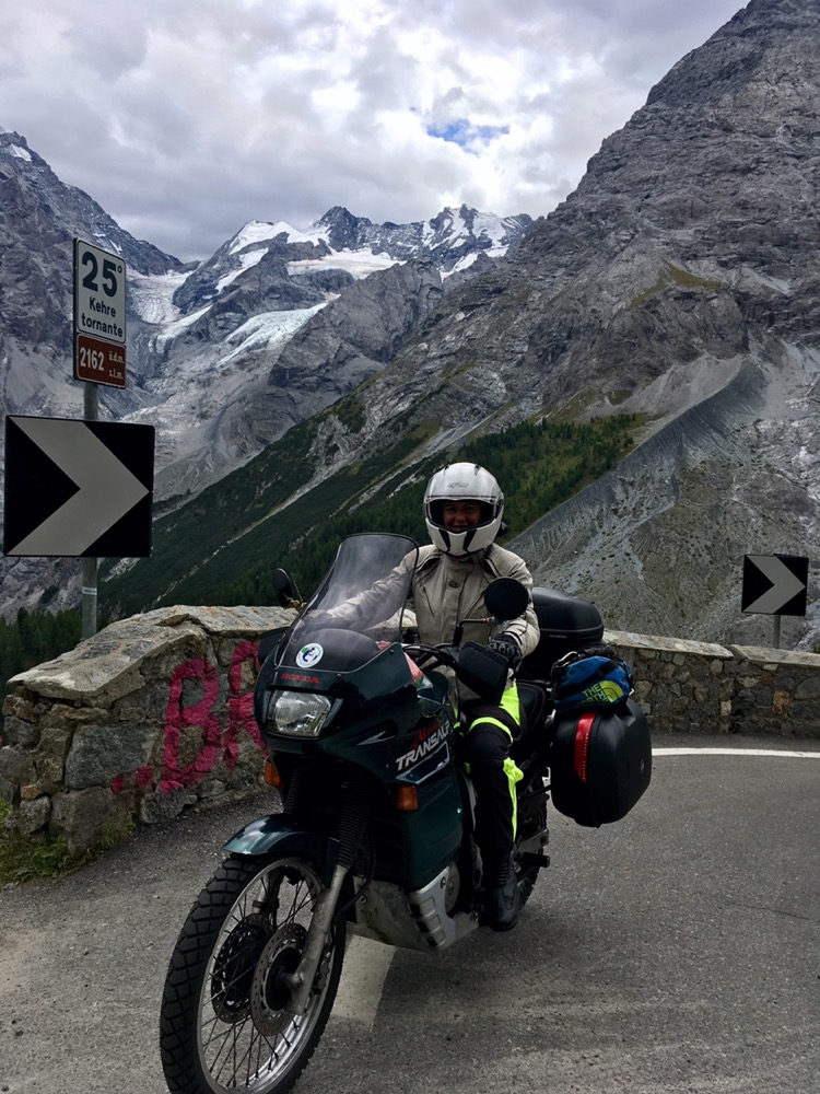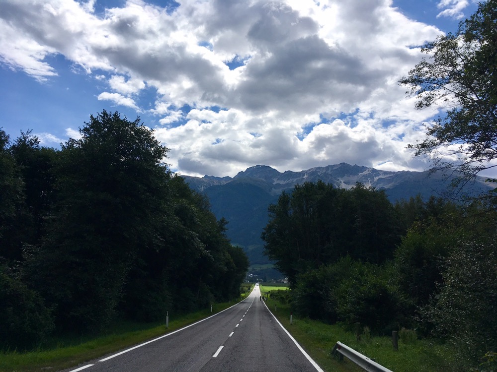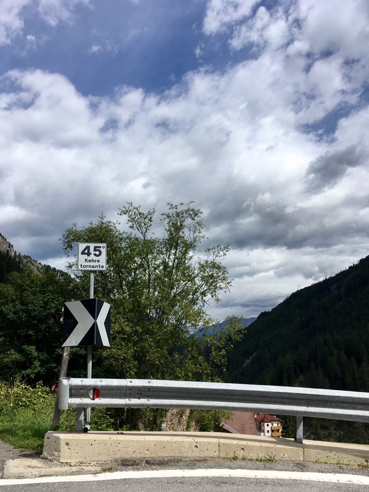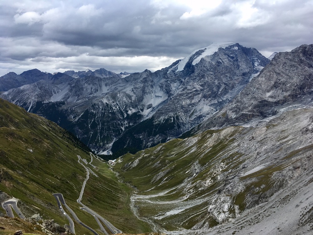 (FR) Dans le rétro, un ciel nuageux qui confirme les prévisions orageuses de la météo. Alors, on regarde devant, et c’est un beau soleil qui nous emmène vers le fameux Passo Dello Stelvio, à plus de 2700m, troisième route plus haute d’Europe.