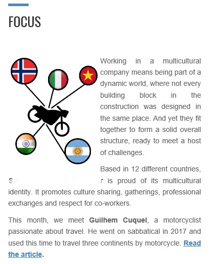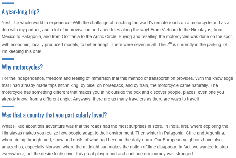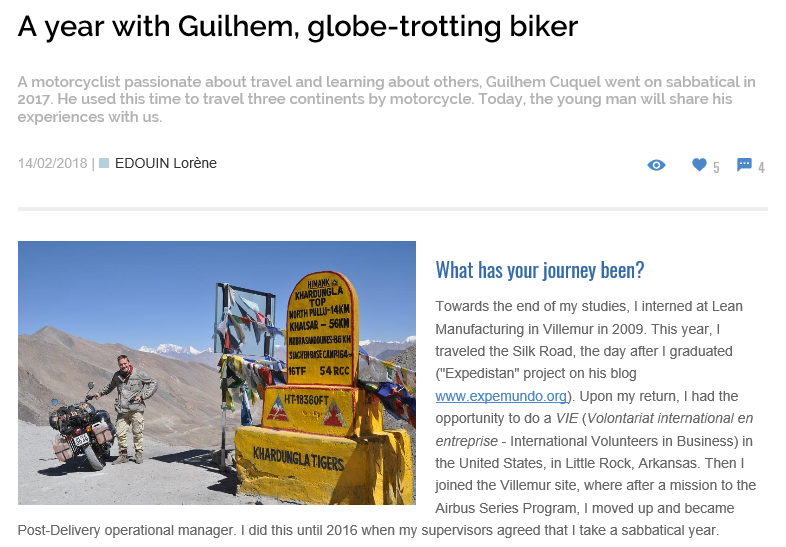 (EN) A really special interview after the motorbike world tour, at work ! In the beginning of this new life, taking things from another angle, getting out of the comfort zone, and sharing a bit of this wonderful world into the office open space. Thanks to the interviewing and graphics team for this nice article.