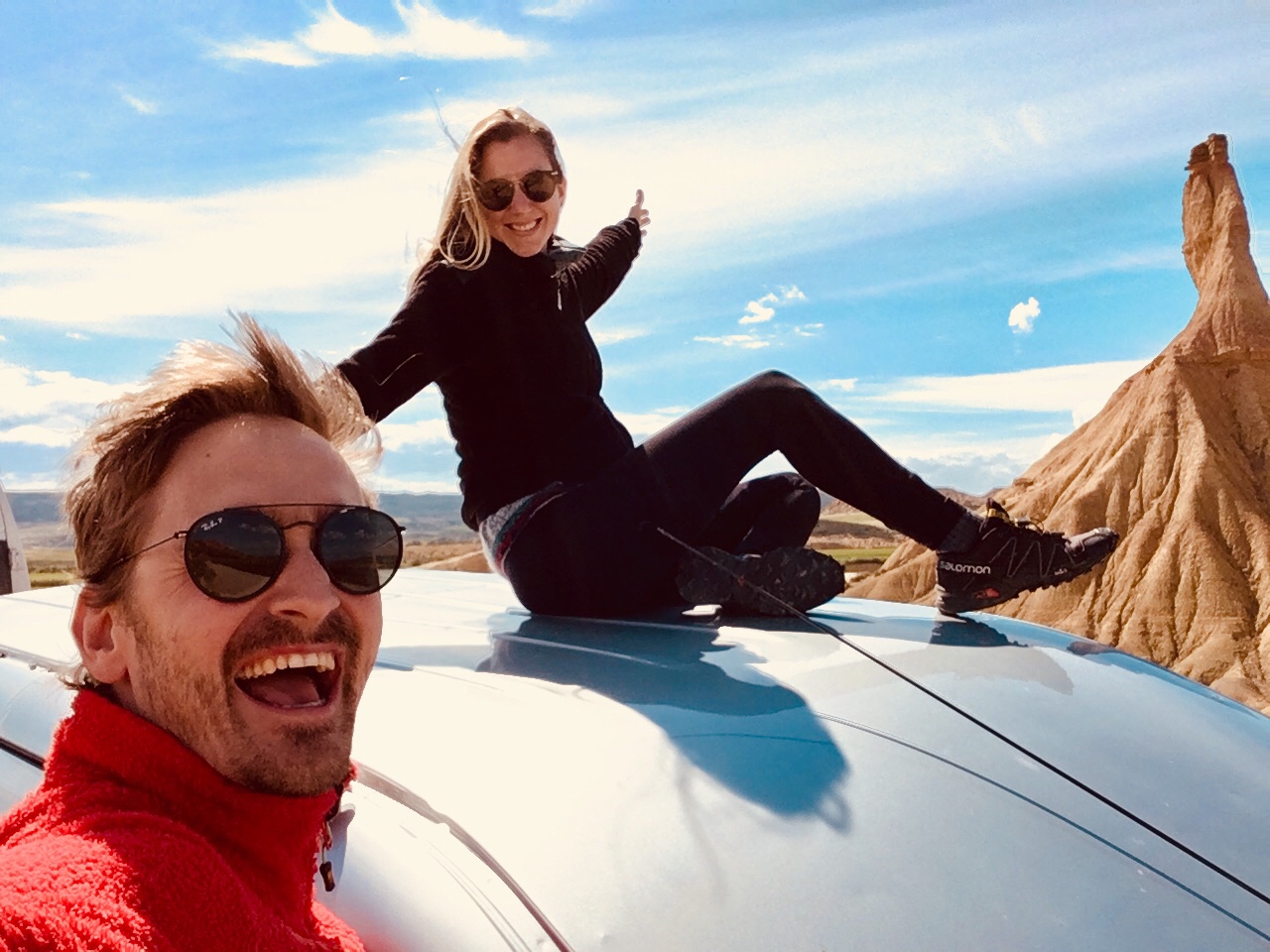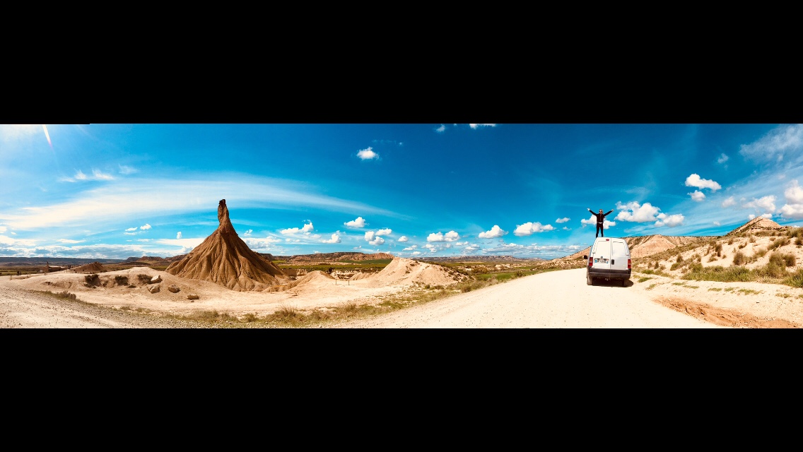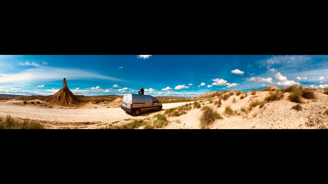 (FR) Entre Navare et Aragon, le désert des Bardenas nous emmène..loin! Dans l’imagination. Et dans les sensations aussi : sécheresse, chaleur, vents. Seuls. Le désert quoi ! Ça ressemble à un décor de road trip, ça tombe bien le van se prête bien à l’exercice des 40km de pistes qui en font le tour.