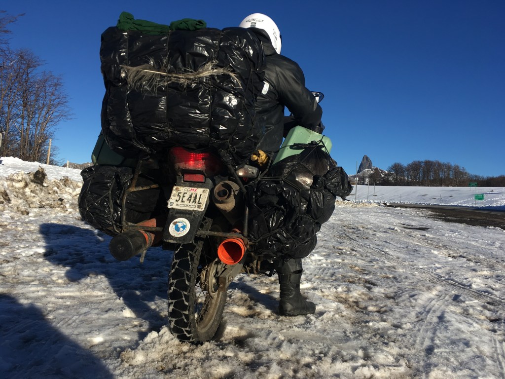 Ida 2, América, Camino extremo Meridional: ¡ Ushuaïa, en Argentina, latitud 54 Sur, padeció a principios de invierno, en la nieve, después de 6 meses y 27000km, a partir de México, con uno 1 Honda Falcon 400cc do Brasil!
